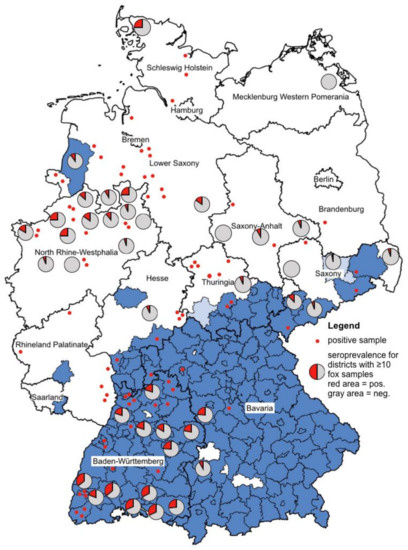 Ideally, in epidemiological studies, in each district, the same number of foxes should be sampled. In this case, the determined prevalence can be compared and a meaningful map can be created. The figure in our study is partially misleading, because not all 1233 samples could be represented. The ratio of positive and negative foxes from districts where 10 or more foxes were examined is shown in pie charts. We visualized the localization of the remaining positive foxes by red dots. However, for clarity reasons, the remaining negative foxes (n = 315) from districts where less than 10 foxes were sampled are not shown in this figure. The majority of these foxes came from non-risk areas. For detailed data, see Table 1 and Table 2.