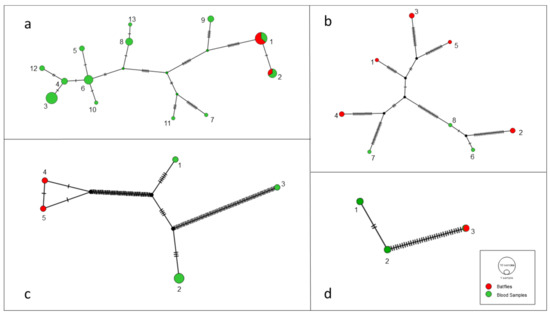 Genotype network with gltA (a), nuoG (b), rpoB (c) and ftsZ (d) sequences obtained from bat blood and ectoparasite samples obtained in the present study.