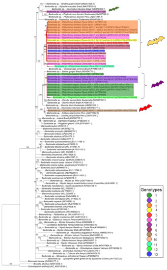 - McKee, C.D.; Bai, Y.; Webb, C.T.; Kosoy, M.Y. Bats are key hosts in the radiation of mammal-associated Bartonella bacteria. BioRxiv 2020. [Google Scholar] [CrossRef]