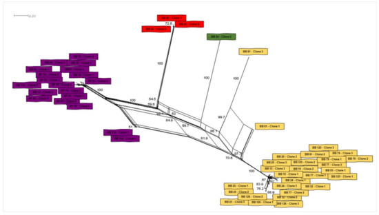Genealogy network analysis of Bartonella spp. gltA sequences-clones obtained from bat blood and flies sampled in the present study. The analysis was performed with Splitstree software using the parameters “Neighbor-Net” with bootstrap of 1000 replicates.
