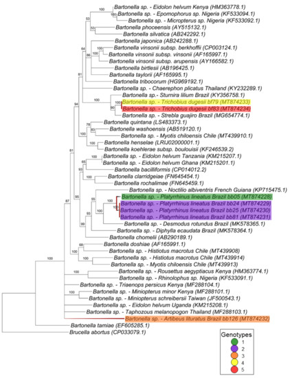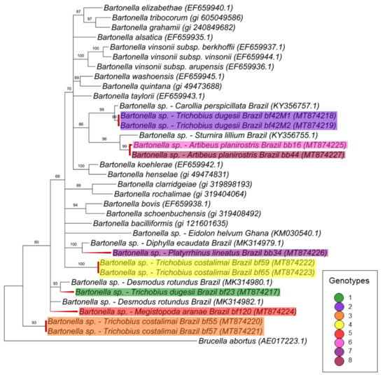 Genotypic diversity of Bartonella spp. in bats and associated ectoparasites has been widely reported [6,34,35,36,37,38,39]. Even though bartonellae genotypes have been detected in bats [12,40] and ectoparasites [41], in Brazil, the occurrence of multiple citrate synthase gltA genotypes in both vertebrate and invertebrate hosts infected by Bartonella spp. has not been assessed so far, since most studies in the literature have focused on the analysis of genetic diversity by targeting different Bartonella housekeeping genes, as previously proposed [42].