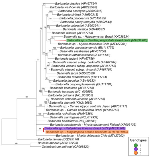 Finally, for the ftsZ gene fragment (521 bp), the three sequences corresponding to one genotype each were positioned in two different branches (Figure 6). The first branch comprised the genotype 1 (represented by a sequence detected in a bat blood sample [C. perspicillata #42]) that clustered together with Bartonella spp. detected in a rodent from Brazil and in a bat from Chile with 76% of posterior probability. The other two sequences, which were represented by genotypes 2 (represented by a sequence detected in a blood sample from P. lineatus #77) and 3 (represented by a sequence detected in M. aranea sample #120), clustered together in a polytomic branch—supported by 96% of posterior probability—with Bartonella bacilliformis, Bartonella naantalensis and Bartonella spp. detected in Myotis chiloensis from Chile.