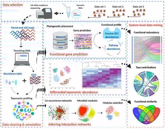 Workflow illustrating the analytical steps of the study. Three data sets were selected from published studies on the microbiome of Ixodes scapularis, fed on mice, from similar lab conditions and protocols. Raw data were obtained from available repositories online, consequently, were processed following the QIIME2 pipeline, i.e., were denoised and identified at the levels of amplicons sequence variant (ASV) and annotated taxonomically based on SILVA 132 database. The ASV profiles and sequences were used to predict the metabolic profile from those microbiomes, based on the bioinformatic tool PICRUSt2. In addition, the taxonomic profiles were compared using the statistical method ALDEx2. The taxonomic profiles were also used to infer co-occurrence networks, from which three modules were extracted in each data set and used to predict their functional profiles. Finally, integrative analyses were performed, linking taxonomic and functional profiles, to assess functional redundancy and functional similarity in each data set.