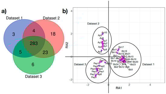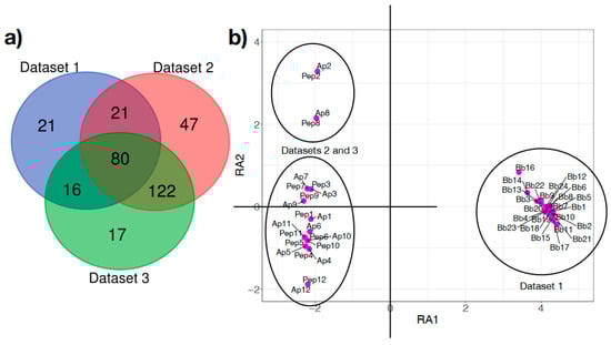 The microbiome of Ixodes scapularis ticks shares a high proportion of functional pathways among tick specimens: (a) Venn diagram of the number of shared functional pathways in the three data sets of Ixodes scapularis. Data sets are the same and labeled in a similar way to those in Figure 2. (b) Plot of the samples of each of the three data sets, separated by a Detrended Canonical Analysis along the taxonomic profile detected in each tick sample. Groups are labeled with the name of the data set and each tick sample (each dot) labeled with letters and a continuous numbering (Bb: Data set 1; Ap: Data set 2; Pep: Data set 3). RA1 and RA2 are the axes in the reduced space after the canonical analysis, explaining the distance among specimens and data sets.