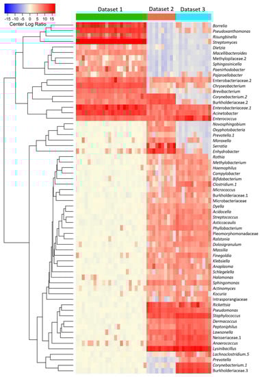 The microbiome of Ixodes scapularis ticks shows bacterial taxa with highly significant differences in relative abundance. The figure shows a heatmap derived from the center log ratio (clr) abundance values of the 60 top bacterial genera in terms of significant differences among the three data sets, as detected by the ALDEx2 algorithm, using a Benjamini—Hochberg correction of p-values (Reiner (Kruskal—Wallis, p < 0.001).