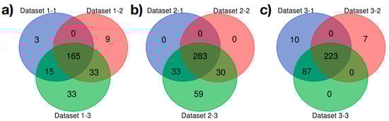 Clusters of co-occurring bacterial taxa in Ixodes scapularis have similar functional profiles. The Venn diagrams show the number of shared metabolic pathways among three modules (communities) of bacterial genera in each data set. The modules were derived from the networks of co-occurring bacteria in each data set. Each group of three modules per data set contains together more than 90% of the total bacterial genera identified in each data set. (a) Data set 1; (b) Data set 2; (c) Data set 3.