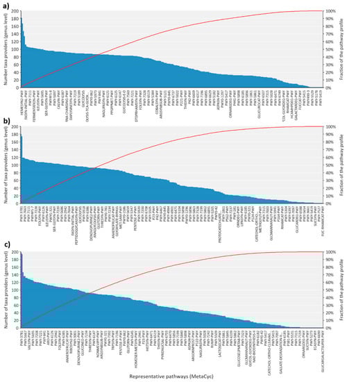 The number of bacterial taxa (collapsed at genus level) that contribute to the predicted metabolic pathways in the microbiome of Ixodes scapularis. The charts include the number of genera as histograms (left y-axis) that contribute to each metabolic pathway (x-axis), together with the fraction of the predicted pathway profile (continuous line, right y-axis). (a) Data set 1; (b) Data set 2; (c) Data set 3.