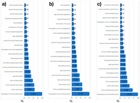 The percent of functional processes represented in the microbiome of Ixodes scapularis. The bars show the functional processes (from MetaCyc pathways maps, collapsed at L3, according to Supplementary Material S1) represented in each of the three data sets of microbiomes of I. scapularis. Only L3 processes represented as more than 1% of the total of each data set are displayed. (a) Data set 1; (b) Data set 2; (c) Data set 3.