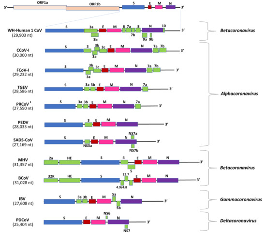 - Michel, C.J.; Mayer, C.; Poch, O.; Thompson, J.D. Characterization of accessory genes in coronavirus genomes. Virol. J. 2020, 17, 131. [Google Scholar] [CrossRef] [PubMed]