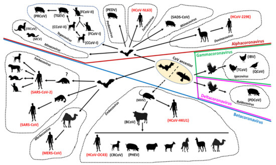 Compared to the other human CoVs and many other zoonotic viruses, the rapidity and extent of human-to-human spread of SARS-CoV-2 has intrigued many researchers [1,3,7]. Although remarkable, this observation might not appear surprising, at least to animal virologists, for studies on animal CoVs have previously revealed the capability of CoVs to jump the species barrier, and successfully adapt and spread in a new host species. Widely prevalent animal CoVs, such as FCoV-II, PEDV, and TGEV, have been proposed to be derived from heterologous hosts including unrelated animal species (Figure 3) [13,15,16,17,18,19].