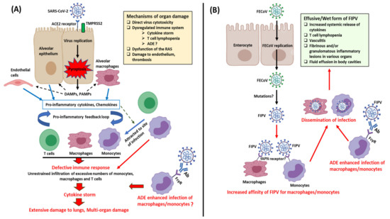Studies on animal CoVs have revealed the enigmatic nature of CoVs, such as alterations in tissue tropism (pantropic CCoV-IIa, FIPV, and PRCoV), multi-organ tropism (BCoV, pantropic CCoV-IIa, FIPV, IBV, MHV, and PHEV), and/or immunopathology (FIPV) [14,16,17,18,19,20,21,22,23,37]. Although changes in the CoV genome have been proposed to induce alterations in tissue tropism, except for that of PRCoV, the molecular basis for such events remain to be clearly elucidated. Interestingly, SARS-CoV-2, considered as a respiratory pathogen, has been associated with extra-clinical manifestations, and viral RNA has been detected in various organs and fecal samples [8,9,137]. Furthermore, the cytokine storm observed in SARS-CoV-2 patients mirrors that in cats with FIP [9,17] (Figure 4). Considering the above, it would be interesting to compare the genetic variations and pathogenesis of SARS-CoV-2 strains from various organs.