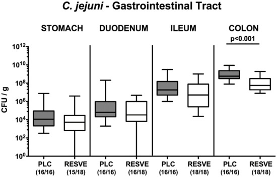 Gastrointestinal C. jejuni loads following resveratrol treatment of infected mice suffering from acute enterocolitis. Starting two days after initial peroral infection with C. jejuni strain 81-176 on day (d) 0 and d1, secondary abiotic IL-10−/− mice were treated with resveratrol (RESVE; white boxes) or placebo (PLC; grey boxes) via the drinking water. On d6 post-infection, C. jejuni loads were quantitatively assessed in distinct parts of the gastrointestinal tract by culture (in colony-forming units (CFU) per g feces). Box plots represent the 75th and 25th percentiles of the median (black bar inside the boxes). Total range, significance levels (p values as determined by the Mann–Whitney test) and the number of culture-positive mice out of the total number of analyzed animals (in parentheses) are given. Data were pooled from three independent experiments.