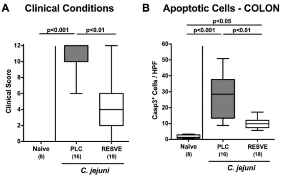 Clinical conditions and microscopic inflammatory responses following resveratrol treatment of infected mice suffering from acute enterocolitis. Starting two days after initial peroral infection with C. jejuni strain 81-176 on d0 and d1, secondary abiotic IL-10−/− mice were treated with resveratrol (RESVE; white boxes) or placebo (PLC; grey boxes) via the drinking water. On d6 post-infection, (A) clinical conditions were quantitatively assessed applying a clinical scoring system. Furthermore, (B) apoptotic cells (cleaved caspase3+, Casp3+) were assessed microscopically from six high-power fields (HPF, 400× magnification) per animal in immunohistochemically stained colonic paraffin sections. Naive mice served as untreated and uninfected controls. Box plots represent the 75th and 25th percentiles of the median (black bar inside the boxes). Total range, significance levels (p values as determined by the Kruskal–Wallis test followed by Dunn’s correction) and numbers of mice (in parentheses) are given. Data were pooled from three independent experiments.