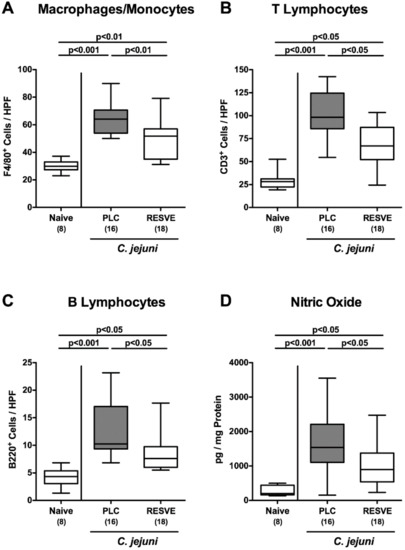 Inflammatory immune responses upon resveratrol treatment of infected mice suffering from acute enterocolitis. Starting two days after initial peroral infection with C. jejuni strain 81-176 on d0 and d1, secondary abiotic IL-10−/− mice were treated with resveratrol (RESVE; white boxes) or placebo (PLC; grey boxes) via the drinking water. On d6 post-infection, (A) macrophages and monocytes (F4/80+), (B) T lymphocytes (CD3+) and (C) B lymphocytes (B220+) were assessed microscopically from six high-power fields (HPF, 400× magnification) per animal in immunohistochemically stained colonic paraffin sections. Furthermore, (D) nitric oxide concentrations were measured in colonic ex vivo biopsies. Naive mice served as untreated and uninfected controls. Box plots represent the 75th and 25th percentiles of the median (black bar inside the boxes). Total range, significance levels (p values as determined by the one-sided ANOVA test followed by Tukey correction or by the Kruskal–Wallis test followed by Dunn’s correction) and numbers of mice (in parentheses) are given. Data were pooled from three independent experiments.