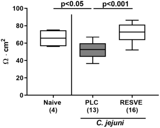 We further addressed whether resveratrol treatment could rescue epithelial barrier function following C. jejuni infection. Therefore, we performed electrophysiological resistance measurements of colonic ex vivo biopsies in the Ussing chamber. In fact, transmural resistances were lower in the large intestines derived from placebo, but not resveratrol-treated mice, at d6 p.i. as compared to naive controls (p < 0.05 versus naive, p < 0.001 versus resveratrol; Figure 4). Hence, resveratrol treatment could effectively rescue colonic epithelial barrier function following C. jejuni infection.