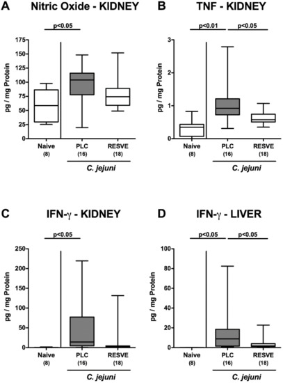 Next, we addressed whether the disease-alleviating effects of resveratrol treatment were restricted to the intestinal tract or also effective in extra-intestinal compartments. Therefore, we measured pro-inflammatory mediators in ex vivo biopsies taken from kidneys and the liver. In fact, increased nitric oxide, TNF-α and IFN-γ concentrations could exclusively be assessed in the kidneys of C. jejuni infected mice from the placebo cohort (p < 0.05–0.001 versus naive; Figure 5A–C), which also held true for hepatic IFN-γ levels (p < 0.05; Figure 5D).