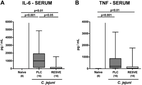 Strikingly, resveratrol-mediated dampening of C. jejuni induced disease could also be observed systemically given that serum IL-6 concentrations were lower following resveratrol as compared to placebo treatment at d6 p.i. (p < 0.05; Figure 6), whereas a trend towards lower TNF-α concentrations could be observed in sera of the former as compared to the latter (not significant due to high standard deviations; Figure 6B). Hence, resveratrol treatment not only alleviated intestinal responses, but also extra-intestinal including systemic C. jejuni induced inflammatory responses.