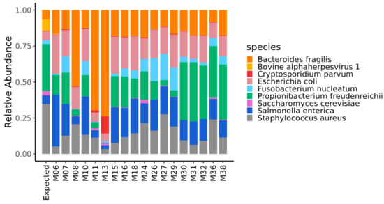 Relative abundance of the microorganisms of the mock community quantified in the DNA metagenomic datasets obtained from spiked salmon. The first bar in the figure refers to the expected relative abundance for the microorganisms experimentally spiked in the salmon.