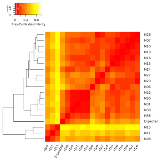 Heat map of Bray–Curtis dissimilarity and average linkage clustering dendrogram showing the similarity between the benchmark (expected) and the DNA metagenomic datasets obtained from spiked salmon, considering the microorganisms of the mock community. In the heat map, when a cell is colored in red, it indicates that the two associated samples (in the corresponding row and column) have an identical composition, while a white cell refers to two samples with the most different composition.