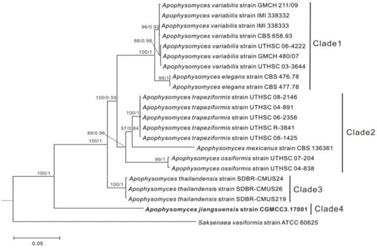 The topologies of each single-gene and the two-gene (ITS, 28S rDNA) trees were similar. Therefore, we show only the two-gene combined tree. According to the phylogenetic result, the Apophysomyces genus was separated into four main clades with high statistical support. Clade 1 (ML/BI = 100/1) contains A. variabilis and A. elegans, whereas clade 2 (ML/BI = 89/0.96) was clustered with A. trapeziformis, A. mexicanus, and A. ossiformis. A. thailandensis was assigned to clade 3 (ML/BI = 100/1). A. jiangsuensis was clearly separated from the other Apophysomyces species and formed an independent lineage (clade 4) with high statistical support (ML/BI = 100/1). A. jiangsuensis is phylogenetically recognized as a novel species (Figure 1).