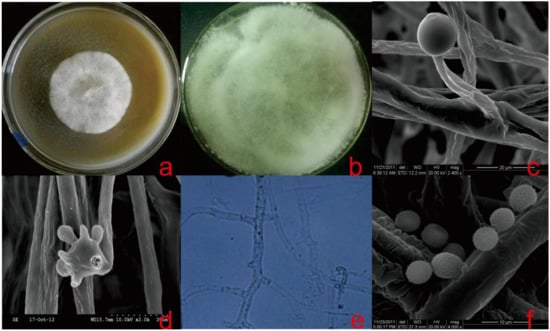 Apophysomyces jiangsuensis. (a) Fungal colony after 72 h on PDA; (b) covered the Petri dish after 5 days on MAM; (c) sporangiophores and sporangia; (d) forming spores and hyphae; (e) septum in the hypha; and (f) spores.