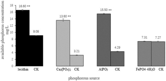 Liquid medium formulation: glucose 10 g, (NH4)2SO4 0.5 g, MgSO4·7H2O 0.3 g, NaC1 11.3 g, KCl 0.3g, FeSO4·7H2O 0.03 g, MnSO4·7H2O 0.03 g, and distilled water 1000 mL. Four phosphorus sources were added to the experimental group, as follows: (1) Ca3(PO4)2 at 5 g; (2) lecithin at 0.6 g and CaCO3 at 5 g; (3) AlPO3 at 4 g; and (4) FePO4·4H2O at 7.2 g, respectively. They were respectively placed in triangle bottles with the liquid content of 50/250 mL, and the inoculating amount was 2%. Then, these bottles were placed on a rotary shaker at 180 rpm and at 28 °C for 4 days. The supernatant was collected by centrifugation, and the available phosphorus content was determined by the molybdenum blue coloration method []. Three replicates were made in each test. The difference between the experimental group and the corresponding control group was determined using Microsoft Excel.