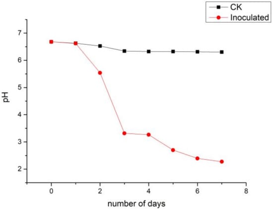 To test the evolution of the pH of the fermented fungal suspension liquor, a modified liquid Martin medium was prepared with the addition of 1.15% NaCl. The initial inoculum dosage was set up at 5% (v/v) to a volume of 150 mL in 250 mL containers, which was then incubated at 28 ± 1 °C at a rotation speed of 160 rpm. The pH was measured every 24 h with triplicates for the treated and control groups.