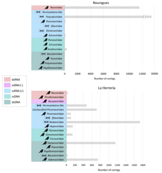 Number of contigs showing similarity to viruses of families infecting animals sequenced from cloacal samples of wild birds from Nouragues (French Guiana) and La Herrería forest (Spain). The colors indicate the type of genome of each family. The ant silhouette highlights those viral families infecting invertebrates. The bird silhouette highlights viral families with reported avian viruses.