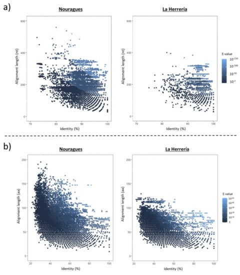 Alignment length (nt, nucleotides; aa, amino acids) vs identity percentage for the contigs obtained in Nouragues and La Herrería cloacal deep sequencing analysis when compared to reference sequences in GenBank using Blastn (a) and Blastx (b). Each dot is colored according to the E-value of the alignment in order to increase the descriptive value of the graph.