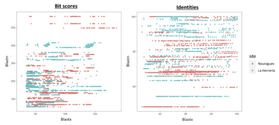 Comparison between values obtained in Blastn and Blastx for bit scores and identity percentages for a given contig in Nouragues and in La Herrería.