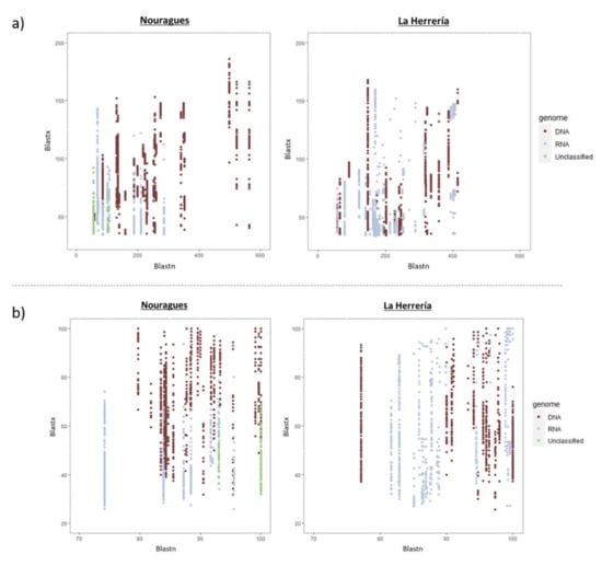 Comparison between values of bit scores (a) and identities (b) of contigs sequenced in Nouragues and La Herrería using Blastn and Blastx considering the type of genome of the novel viruses. The type of genome (DNA, RNA or unclassified) was obtained from the viral group each contig was assigned to by the software MEGAN.