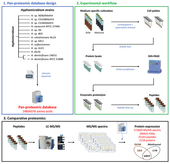 The pan-proteomics approach used to rapidly characterise the proteome of Hyphomicrobium sp. MC8b strain of unknown genome sequence (Figure 1) consisted of using a database with the predicted proteomes of 13 taxonomically closely related strains to Hyphomicrobium sp. MC8b (listed in Materials and Methods). Strain MC8b was grown with DCM or with methanol as the sole carbon and energy source, in quintuple replicates for each condition (Supplementary Table S1), and comparative proteomics were performed by nanoLC-MS/MS and interpretation of the recorded spectra using the pan-proteomics database.