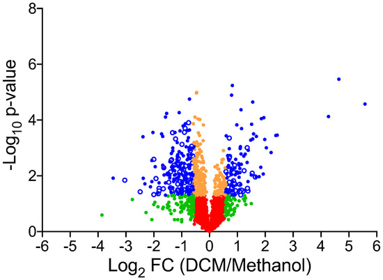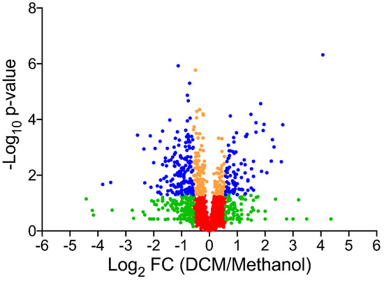 Comparative pan-proteomics analysis of Hyphomicrobium sp. MC8b. Volcano plot of protein abundances under dichloromethane versus methanol growth conditions. Proteins are distributed depending on their abundance fold-change and p-value. Blue proteins show significant fold-change (≥1.5) and are significantly differentially abundant (p value ≤ 0.05). Proteins in orange (p-value ≤ 0.05 but fold-change ≤ 1.5), green (fold-change ≥ 1.5 but p-value ≥ 0.05), and red (fold-change ≤ 1.5, p-value ≥ 0.05) were not further considered.
