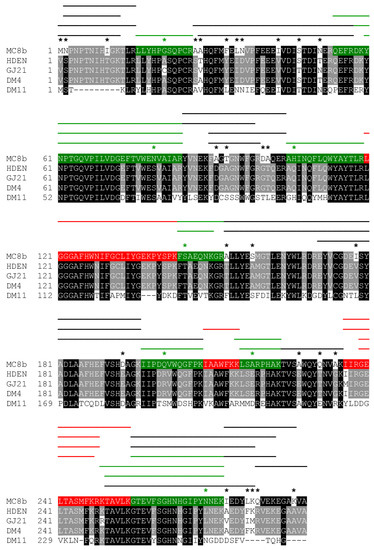 Sequence alignment of selected DCM dehalogenases covering the known sequence diversity of DCM dehalogenases, highlighting the highly divergent sequence of Hyphomicrobium sp. MC8b DcmA sequence detected and partially predicted using pan-proteomics analysis, and verified by sequencing of the MC8b genome. All peptides detected using the pan-proteomics Hypomicrobium database analysed in normal or error-tolerant mode are shown in red and green, respectively. Additional peptides detected by analysis of obtained spectra using the predicted proteome of strain MC8b based on the genome sequence of the strain are shown by black lines. A star denotes a sequence difference in the DcmA sequence of strain MC8b compared to that of strain H. sp. GJ21 and/or H. denitrificans ATCC 51888 (HDEN). Green stars indicate sequence variations in the MC8b DcmA sequence that prevented detection of peptides by analysis of the Hyphomicrobium database in the absence of error tolerance, and black stars indicate sequence variations extending beyond the one-mismatch threshold for peptide detection in error-tolerant mode, respectively.