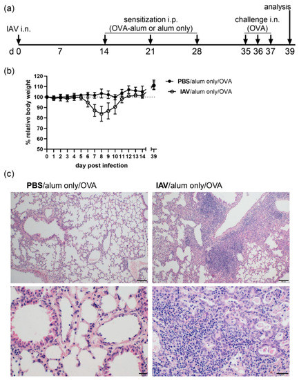 Two weeks after IAV infection or control treatment, mice were sensitized i.p. with 10 µg ovalbumin (OVA, grade V, Sigma-Aldrich, St. Louis, MO, USA) in PBS containing 1 mg aluminum hydroxide (alum; ImjectTM Alum Adjuvant, Thermo Fisher) in weekly intervals (day 14, 21, 28). Control mice were mock-sensitized i.p. with alum only. One week after the last sensitization, on three consecutive days (day 35, 36, 37) all mice were i.n. challenged with 100 µg OVA (grade III, Sigma-Aldrich) in 30 µL PBS under light isoflurane anesthesia. Forty-eight hours after the last challenge (day 39), mice were sacrificed and bronchoalveolar lavage (BAL), serum and lungs were harvested for further analyses.