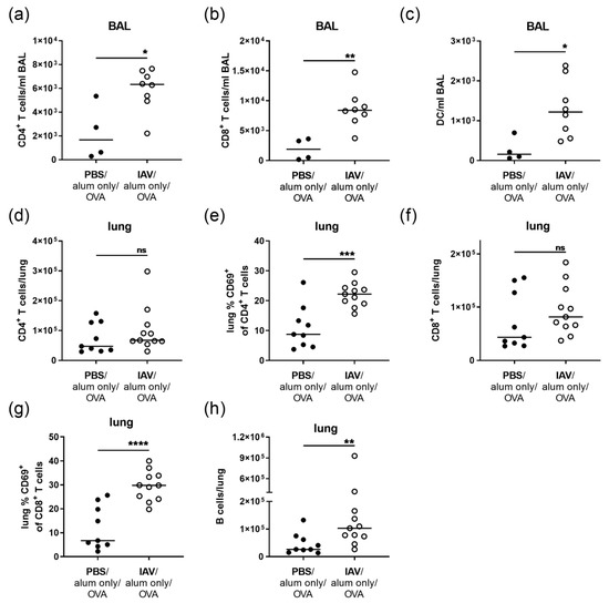 Resolved IAV infection leads to elevated T cell numbers in the BAL and to persistent T cell activation as well as accumulation of B cells in the lung. Mice were infected i.n. with a sublethal dose of IAV or treated with PBS on day 0, were mock-sensitized (alum only i.p.; days 14, 21, 28) and treated i.n. with OVA (days 35, 36, 37). On day 39 post infection, CD4+ T cell (a), CD8+ T cell (b) and DC (c) numbers in the BAL (bronchoalveolar lavage) were flow cytometrically analyzed. In the lung, CD4+ T cell numbers (d), CD69-expression of CD4+ T cells (e), CD8+ T cell numbers (f), CD69-expression of CD8+ T cells (g) and B cell numbers (h) were analyzed. Data are shown for individual mice together with the group median. BAL data are compiled from at least two independent experiments and lung data are compiled from three independent experiments. * p < 0.05, ** p < 0.01, *** p < 0.005, **** p < 0.001, ns = not significant.