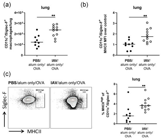 Resolved IAV infection leads to the accumulation of CD11c+/Siglec-F+ macrophages with increased MHCII expression the lung. Mice were infected i.n. with a sublethal dose of IAV or treated with PBS on day 0, were mock-sensitized (alum only i.p.; days 14, 21, 28) and treated i.n. with OVA (days 35, 36, 37). On day 39 post infection, CD11c+/Siglec-F+ macrophage numbers (a), CD11c+/Siglec-F+ macrophage MHCII expression (MFI, median fluorescence intensity) (b) and the frequency of MHCIIhigh CD11c+/Siglec-F+ macrophages in the CD11c+/Siglec-F+ macrophage population (c) were flow cytometrically analyzed. Data are shown for individual mice together with the group median. Representative flow cytometry plots show MHCII expression of the gated CD11c+/Siglec-F+ macrophage population of an uninfected and an infected mouse. Data are compiled from three independent experiments. ** p < 0.01.