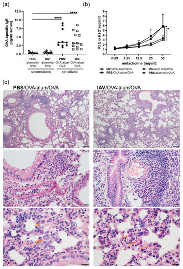 Resolved IAV infection does not affect IgE production and airway hyperreactivity but affects histological changes in AAI. Mice were infected i.n. with a sublethal dose of IAV or treated with PBS on day 0, were sensitized against OVA i.p or mock-sensitized with alum only i.p. on days 14, 21 and 28 and all mice were challenged i.n. with OVA on days 35, 36 and 37. On day 39 post infection, OVA-specific IgE levels in the serum (a), airway hyperreactivity in terms of lung resistance (RI) in response to metacholine (b) and histological changes in hematoxylin and eosin stained lung tissue (c) were analyzed. In (a), data are shown for individual mice compiled from three independent experiments together with the group median. In (b) the mean + SD of n = 4 control mice (PBS/alum only/OVA) and n ≥ 5 IAV infected only (IAV/alum only/OVA), sensitized only (PBS/OVA-alum/OVA) or IAV infected and sensitized mice (IAV/OVA-alum/OVA) compiled from two independent experiments are shown. p-values in (b) refer to RI following administration of 50 mg/mL metacholine. In (c), representative images for one out of 5 analyzed mice/group are shown. The upper images were prepared at 100× magnification (scale bar 100 µm), the images of the middle panel at 400× magnification (scale bar 20 µm) and the lower panel at 600× magnification (scale bar 20 µm). Orange single arrows point at alveolar histiocytosis, double arrows at multinucleated macrophages and blue circles at eosinophils. * p < 0.05, **** p < 0.001.
