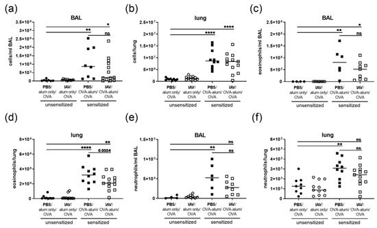 Data for all experimental groups were tested for normality using the Shapiro–Wilk normality test. In the case of Gaussian distribution for all groups in a comparison, an unpaired two-sided t-test or one-way ANOVA and Bonferroni post-hoc test was performed. In the case of non-Gaussian distribution in at least one of the groups in a comparison, an unpaired two-sided Mann–Whitney test or a Kruskal–Wallis test with Dunn’s post-hoc test was performed. To assess the effects of IAV infection alone in our experimental setup, direct comparison of IAV infected, mock-sensitized mice (IAV/alum only/OVA) and PBS-treated, mock-sensitized mice (PBS/alum only/OVA) was performed (t-test or Mann–Whitney test). To test for the induction of AAI, comparison of PBS-treated, sensitized mice (PBS/OVA-alum/OVA) and IAV infected, sensitized mice (IAV/OVA-alum/OVA) to the PBS-treated, mock-sensitized control group (PBS/alum only/OVA) was performed (one-way ANOVA or Kruskal–Wallis test). To assess the effects of resolved IAV infection on AAI, direct comparison between PBS-treated, sensitized mice (PBS/OVA-alum/OVA) and IAV infected, sensitized mice (IAV/OVA-alum/OVA) was performed (t-test or Mann–Whitney test). p ≤ 0.05 was considered indicative of statistical significance (* p < 0.05, ** p < 0.01, *** p < 0.005, **** p < 0.0001). All statistical analyses were performed using the Graph Pad Prism software version 8 (Graph Pad Software). The groups’ medians were used to calculate the fold-changes indicated in the text.