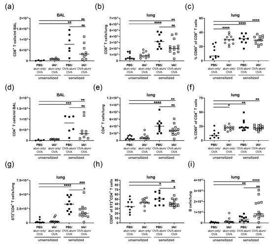 Taken together, resolved IAV infection significantly reduced the recruitment and activation of Th2 cells in the lung and significantly increased lung B cell numbers in AAI.