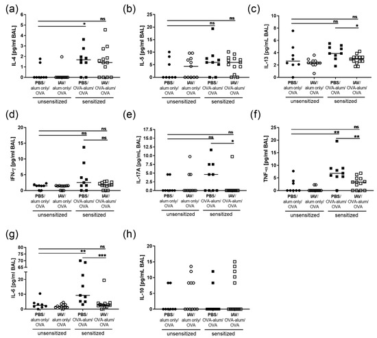 Resolved IAV infection significantly inhibits the pro-inflammatory cytokine response in AAI. Mice were infected i.n. with a sublethal dose of IAV or treated with PBS on day 0, were sensitized against OVA i.p or mock-sensitized with alum only i.p. on days 14, 21 and 28 and all mice were challenged i.n. with OVA on days 35, 36 and 37. On day 39 post infection, BAL levels of IL-4 (a), IL-5 (b), IL-13 (c), IFN-γ (d), IL-17A (e), TNF-α (f), IL-6 (g) and IL-10 (h) were analyzed. Data are shown for individual mice together with the group median. BAL samples were collected in three independent experiments. * p < 0.05, ** p < 0.01, *** p < 0.005, ns = not significant.