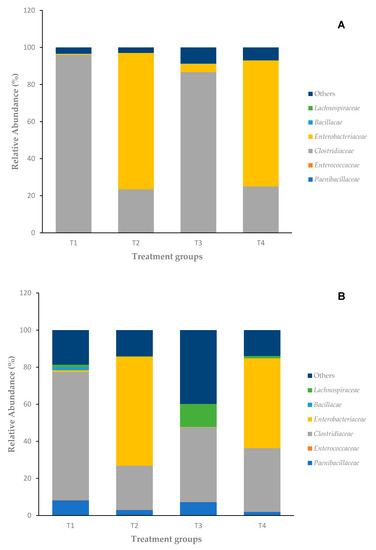 The infection by Salmonella seemed to provoke an increase in Enterobacteriaceae at the detriment of Clostridiaceae, regardless of the age of the birds. When comparing the Salmonella-challenged group (T2) with the Salmonella-challenged with bacitracin in feed group (T4), there is not much difference in diversity and frequency of families on day 2, but there is a notable decrease in Enterobacteriaceae and increase in Lachnospiraceae, and to a lesser degree, increased frequency of Clostridiaceae and decreased frequency of Paenibacillaceae. Birds infected with Salmonella and fed control feed (T2) were observed to have decreased frequency of Enterobacteriaceae (58.9%) as compared to day 2, and a starting presence of Paenibacillaceae (3.02%) with not much change in the Clostridiaceae frequency (23.8%). The addition of subtherapeutic BMD feed had no major effect on the bacterial composition at day 2 (T3 vs. T1); however, in non-infected birds at day 4, it provoked an increase in Lachnospiraceae and other species at the detriment of Clostridiaceae (T3 vs. T1). In contrast, S. Enteritidis-challenged birds at day 4 with added BMD provoked a significant 10% increase in Clostridiaceae compared to a 10% decrease in Enterobacteriaceae (T4 vs. T2).