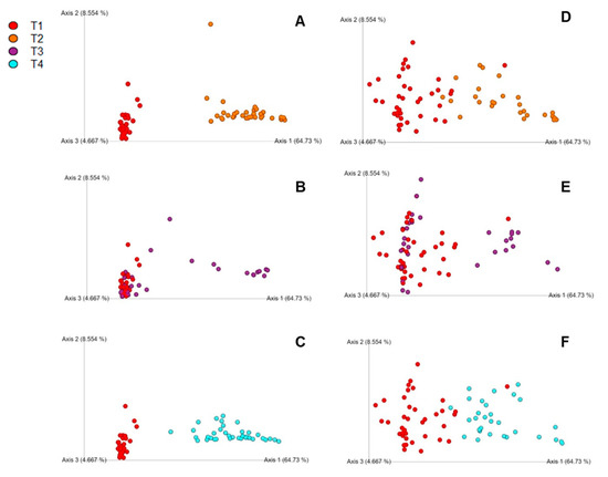 (A–C) Principle coordinate analysis (PCoA) charts using Unifrac for day 2 comparison of treatments: (A) T1 vs. T2, (B) T1 vs. T3, (C) T1 vs. T4; (D–F) PCoA charts using Unifrac for day 4 comparison of treatments: (D) T1 vs. T2, (E) T1 vs. T3, (F) T1 vs. T4. The legend is located at the top left of the figure.
