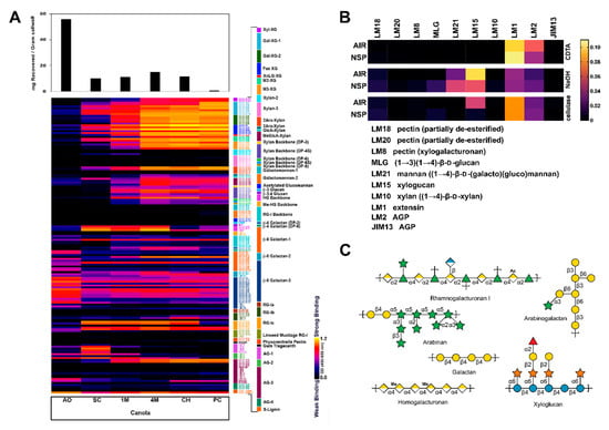 Cell wall glycome profiling of canola meal. Canola meal (CM) plant cell wall extracts were analyzed through an enzyme-linked immunosorbent assay (ELISA)-based screen against a collection of (A) 155 plant cell wall or (B) 10 glycosidic linkage-specific glycan-directed monoclonal antibodies (mAbs) analysed through MicroArray Polymer Profiling (MAPP). (A) Each column represents the different fractions from polysaccharide extractions of the CM plant cell wall: Ammonium oxalate (AO); sodium carbonate (SC); 1 M KOH (1M); 4 M KOH (4M); chlorite (CH); post-chlorite (PC). The colour of each element in the map reflects the strength of the ELISA signal (black = no binding, yellow = strong binding). The antibodies are grouped according to the epitopes that they recognize (bar at the right of the profiles). Each row reflects the binding pattern of a single mAB against the series of CM extracts. The bar graphs above the glycome profiles show the amounts of carbohydrate present in each extract. (B) Each column represents the binding pattern of a mAb, as indicated. Each row reflects the different fractions of polysaccharide extractions by CDTA, NaOH, or cellulase treatment for CM alcohol insoluble residue (AIR) or non-starch polysaccharide (NSP). (C) Based on the results from the ELISA-based polysaccharide composition screens, schematics were drawn for the dominant polysaccharides found in CM. Monosaccharide symbols follow the SNFG (Symbol Nomenclature for Glycans) system [57].