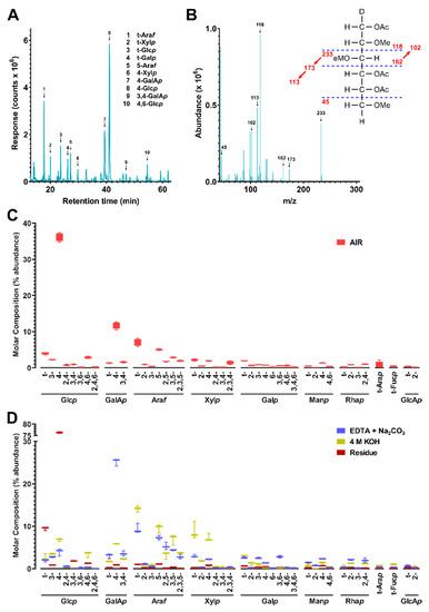 Cell wall linkage composition of cold-pressed canola meal. (A) Total ion current (TIC) chromatogram of cold-pressed canola meal (CM) non-starch polysaccharides (NSP) analyzed by PMAA gas chromatography-mass spectrometry (GC-MS). (B) Mass spectrum of example PMAA from 4-Glcp (β-1,4-linked glucopyranose). Peaks in TIC chromatogram (A) were assigned to linkages based on their MS fragmentation patterns and retention times by referring to those of standards. (C,D) Calculated relative composition of linkages (molar%) from peaks shown in (A) for (C) CM alcohol insoluble residue (AIR) and (D) fractionated extracts of EDTA + Na2CO3, 4 M KOH, or residue A pre-treatment of NaBD4 was conducted to the cell wall before its sequential fractionation in order to increase the extricability of polysaccharides. Four separate experiments were conducted to cell wall and three to each fraction. Values are averages from the separate experiments, presented as bar and whiskers with error bars representing the standard deviation from the mean.