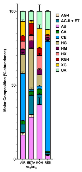 Estimated polysaccharide composition of cold-pressed canola meal cell wall (de-starched AIR) and its three fractions (EDTA + Na2CO3, 4 M KOH, Residue). The composition of polysaccharides was estimated based on linkage composition data (Figure 2 and Supplemental Table S1) by assigning the linkages of uronic acids and neutral sugars to polysaccharides (Table 1; as in [36]). A pre-treatment of NaBD4 was conducted to the cell wall before its sequential fractionation in order to increase the extricability of polysaccharides. Four separate experiments conducted to cell wall and three to each fraction. Stacked bar plots are shown, with a mean value from the separate experiments represented as a horizontal bar and bars depicting the standard deviation from the mean. The polysaccharides were assigned as in Table 1: Arabinan (AB), type I arabinogalactan (AG-I), type II arabinogalactan (AG-II) and extensin (ET), heteroxylan (HX), xyloglucan (XG), callose (CA), cellulose (CE), rhamnogalacturonan I (RG-I), homogalacturonan (HG), heteromannan (HM), and unassigned linkages (UA).