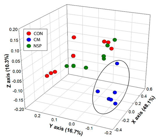 Unweighted UniFrac principal coordinate analysis of cecal communities within mini-bioreactor vessels containing the basal medium (CON), the basal medium with cold press extracted canola meal (CM), and the basal medium with non-starch polysaccharides extracted from canola meal (NSP). Replicate vessels were combined for Illumina characterization of bacterial communities. The ellipsoid illustrates clustering of bacterial communities for the CM treatment, relative to communities for the NSP and CON treatments.