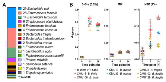 Bacteria were isolated directly from cecal digesta or from the bioreactors (days 3 and 10); 332 isolates able to grow on an agar medium supplemented with MM and CM or CM NSP as a carbohydrate source were recovered. Of the 332 isolates, 325 were culturable in liquid rich media. We identified 100 intestinal bacterial isolates with the ability to degrade and metabolize CM NSP via growth on CM NSP-supplemented agar plates, and subsequent species identification was performed via 16S rDNA sequencing using degenerate 27F and 1492R primers [42,43] (Figure 5A). Enterococcus spp., and Bacteroides spp. were the most predominant bacteria able to utilize CM NSP.