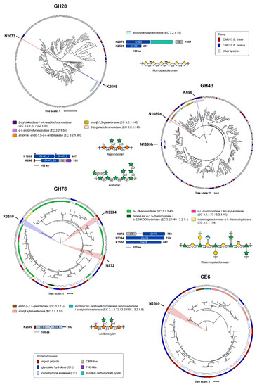 The selected targets were further analyzed by InterProScan [55] to identify any accessory modules of interest (Figure 6). Five of the eight enzymes selected were determined to be multimodular. Of note, the CMU13 GH28 CAZyme N2073 contains a putative carbohydrate lyase domain that was not identified by dbCAN; and CMU13 N1089 contains two tandem GH43 subfamily 2 domains, only one of which is divergent from other GH43 family members in the phylogenetic tree.