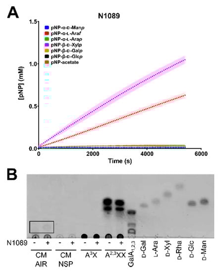 In order to screen CAZymes for function, colourimetric pNP assays were used. When pNP-sugar conjugate substrates are cleaved by enzymes with the required activity, the products can be detected and quantified spectrophotometrically. The GH43 family enzyme N1089 can function as both an arabinofuranosidase and xylosidase, consistent with other GH43 enzymatic activities (Figure 7A), whereas the GH28 enzyme K2605 demonstrated faint activity on pNP-galactose (data not shown), with no detectable activity on other pNP-sugar substrates.